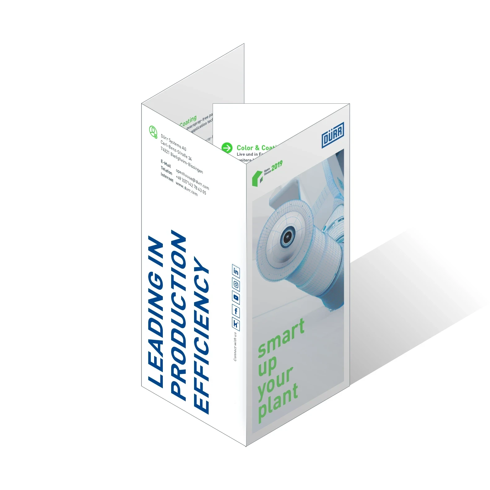 Beispiel Faltblatt Open House Außenseiten – Die Vorderseite (B) präsentiert das Motto der Veranstaltung in einer Big-Type-Formatierung, die direkt auf dem Bild platziert wird. Die Rückseite (A) schließt mit den Kontaktmöglichkeiten und – noch etwas lauter – mit dem gestürzten Dürr-Claim ab.