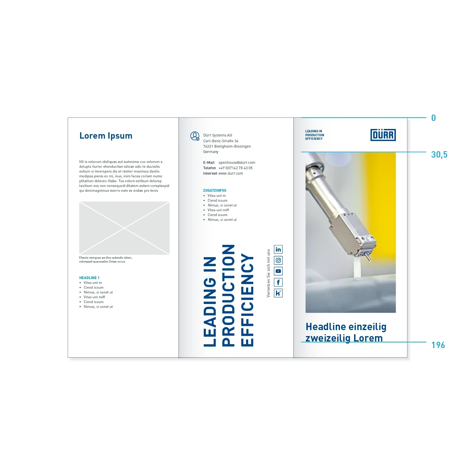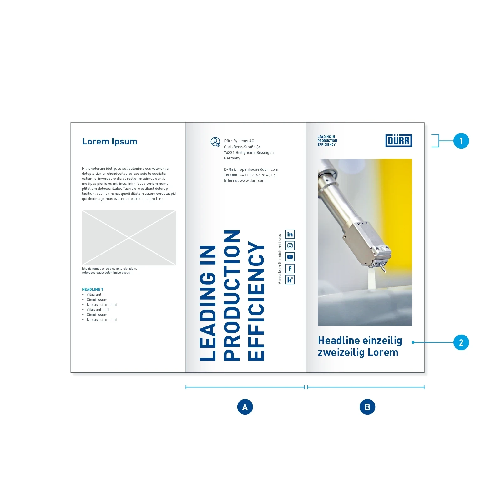Die Faltblätter sind kleine, konzentrierte und schnell zu erfassende Printprodukte. Das Dürr Corporate Design definiert für Faltblätter klare Richtlinien, bietet aber auch genügend Flexibilität für besondere Anwendungen. Dabei können Faltblätter plakativ und laut, aber auch fein und informativ gestaltet werden. Das Layout richtet sich nach der grundlegenden Gestaltungssystematik der Print-Kommunikation von Dürr.