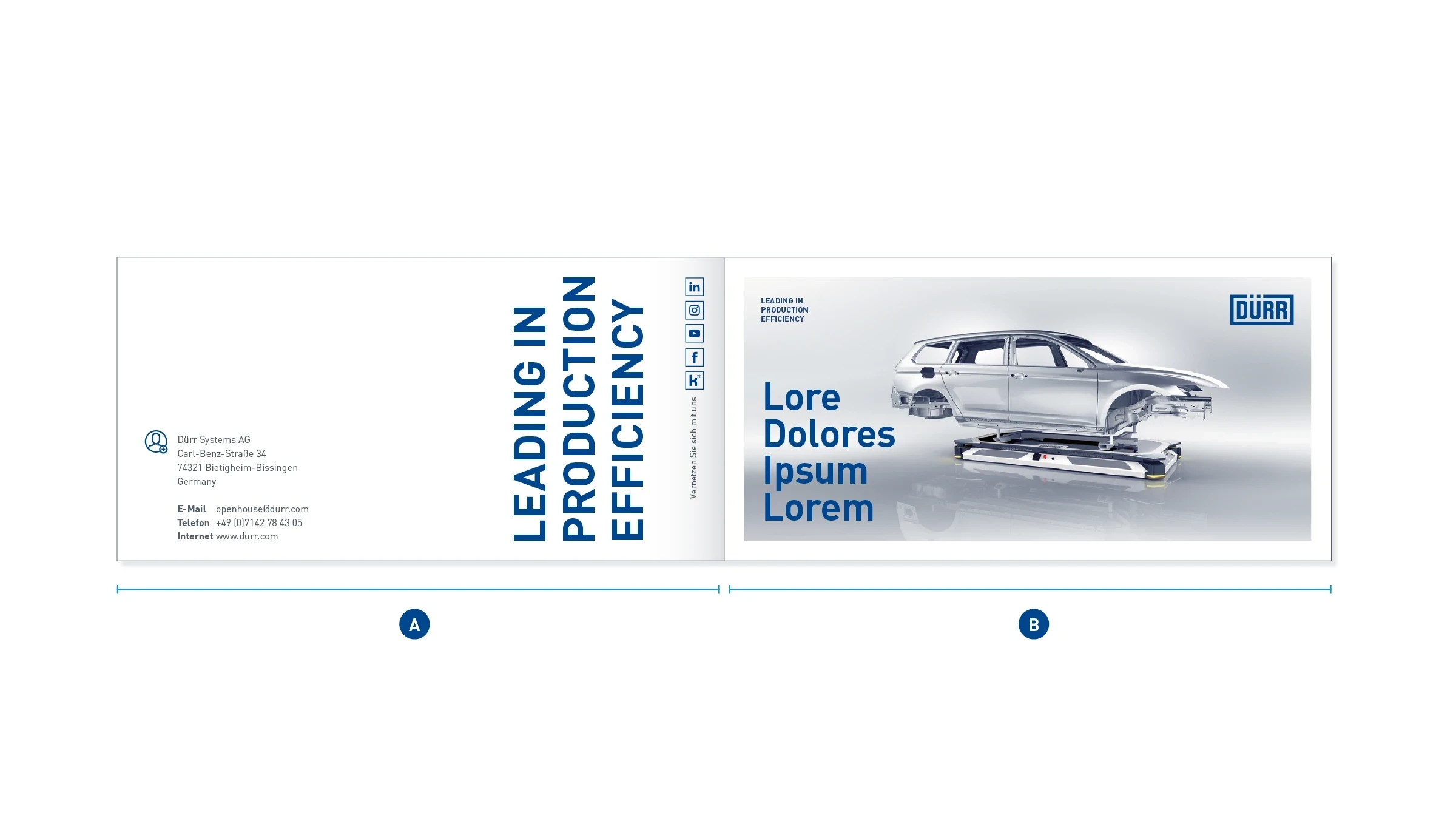 Beispiel Außenseiten – Die Vorderseite des Faltblatts (B) arbeitet mit einer kompakt gesetzten Big-Type-Headline. Die Rückseite (A) schließt laut mit dem gestürzten Dürr-Claim ab. Hinzu kommt der Adressblock, der den Weißraum klar definiert.