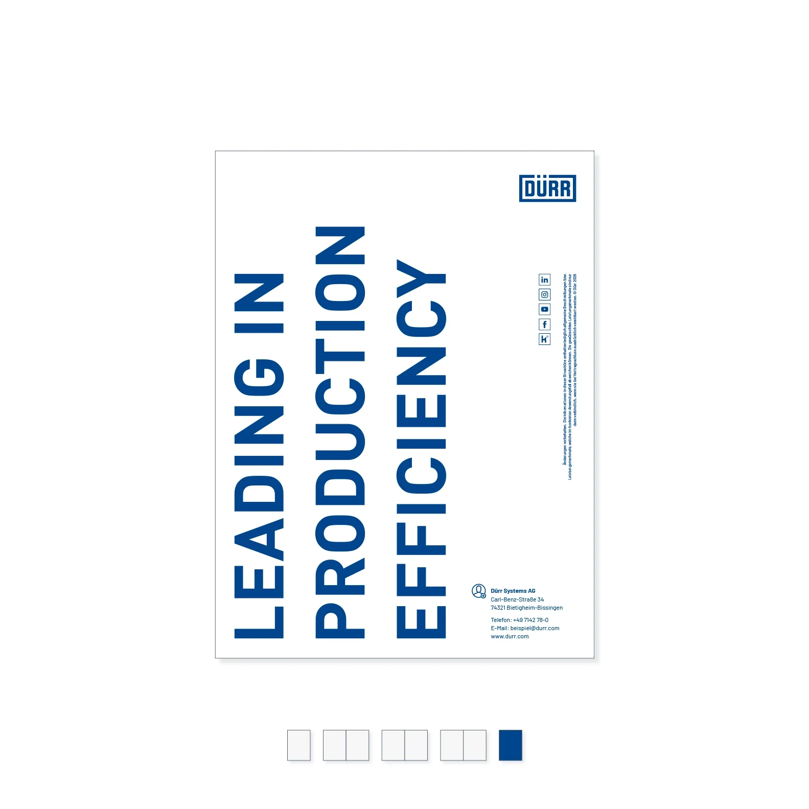 Brochures have not lost any of their value with the arrival of the digital age – quite the opposite. This compact print medium is a valuable form of advertisement in sales and at trade fairs, but also as a digital download. Product brochures have a very clear focus. They give a concise summary of the customer benefits and Dürr’s expertise.